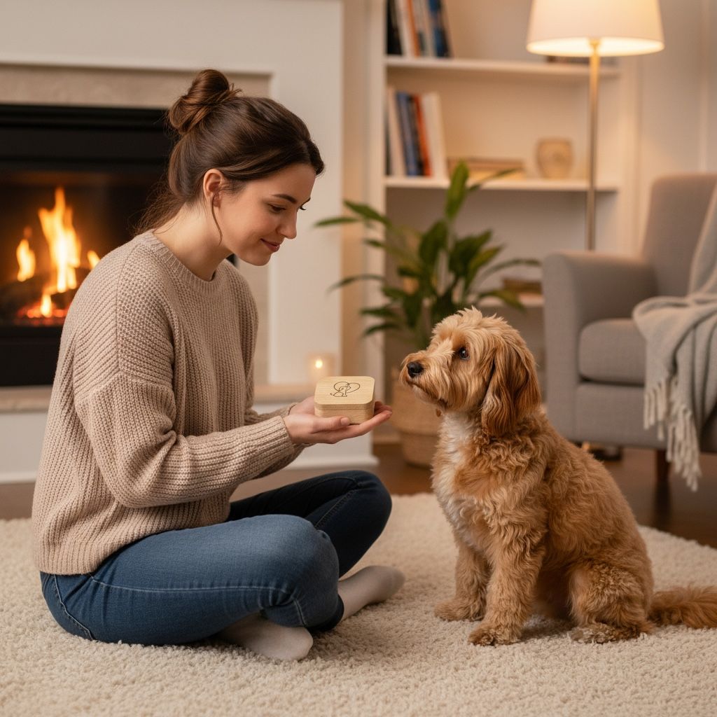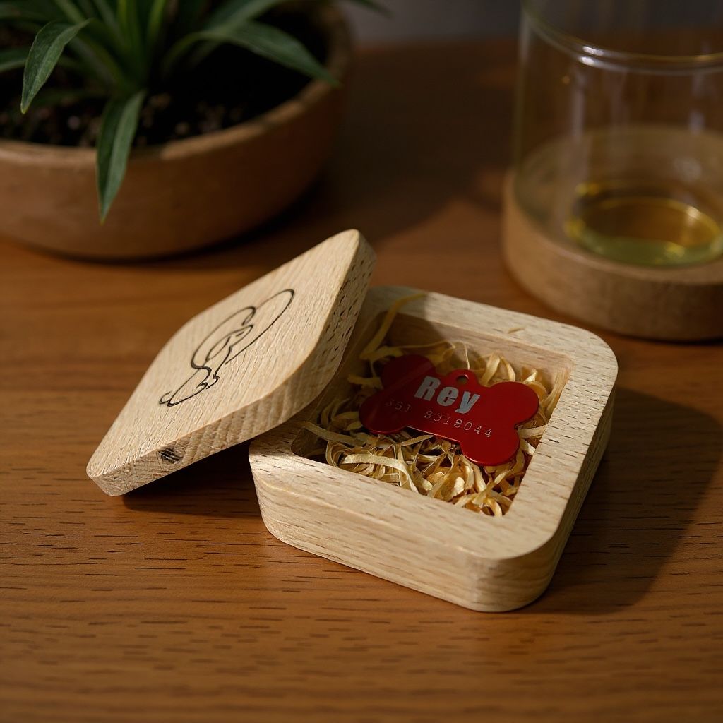 Rendi speciale ogni dettaglio della vita del tuo amico a quattro zampe con questo raffinato cofanetto in legno naturale, perfetto per custodire una medaglietta personalizzata. La scatolina, realizzata con cura artigianale, presenta un coperchio decorato da un delicato disegno inciso e un interno riempito con trucioli morbidi che proteggono la targhetta.