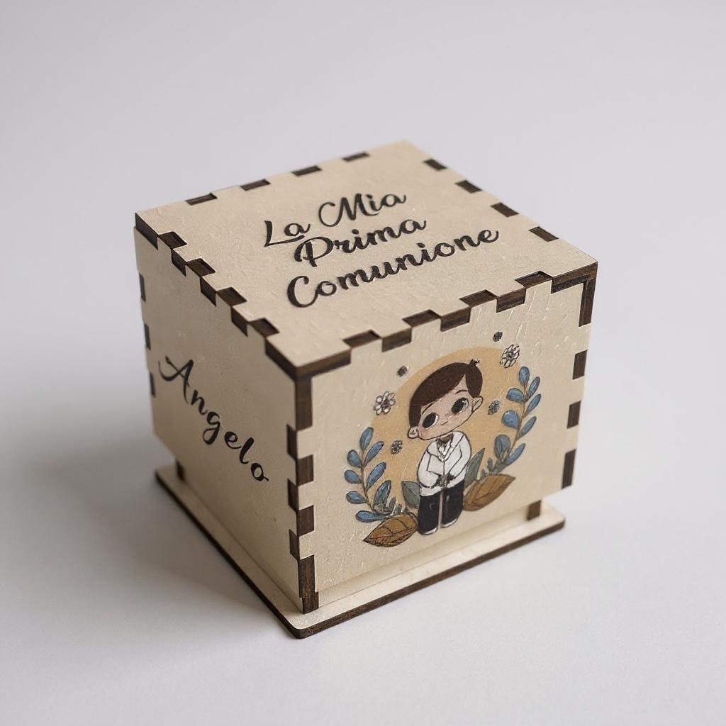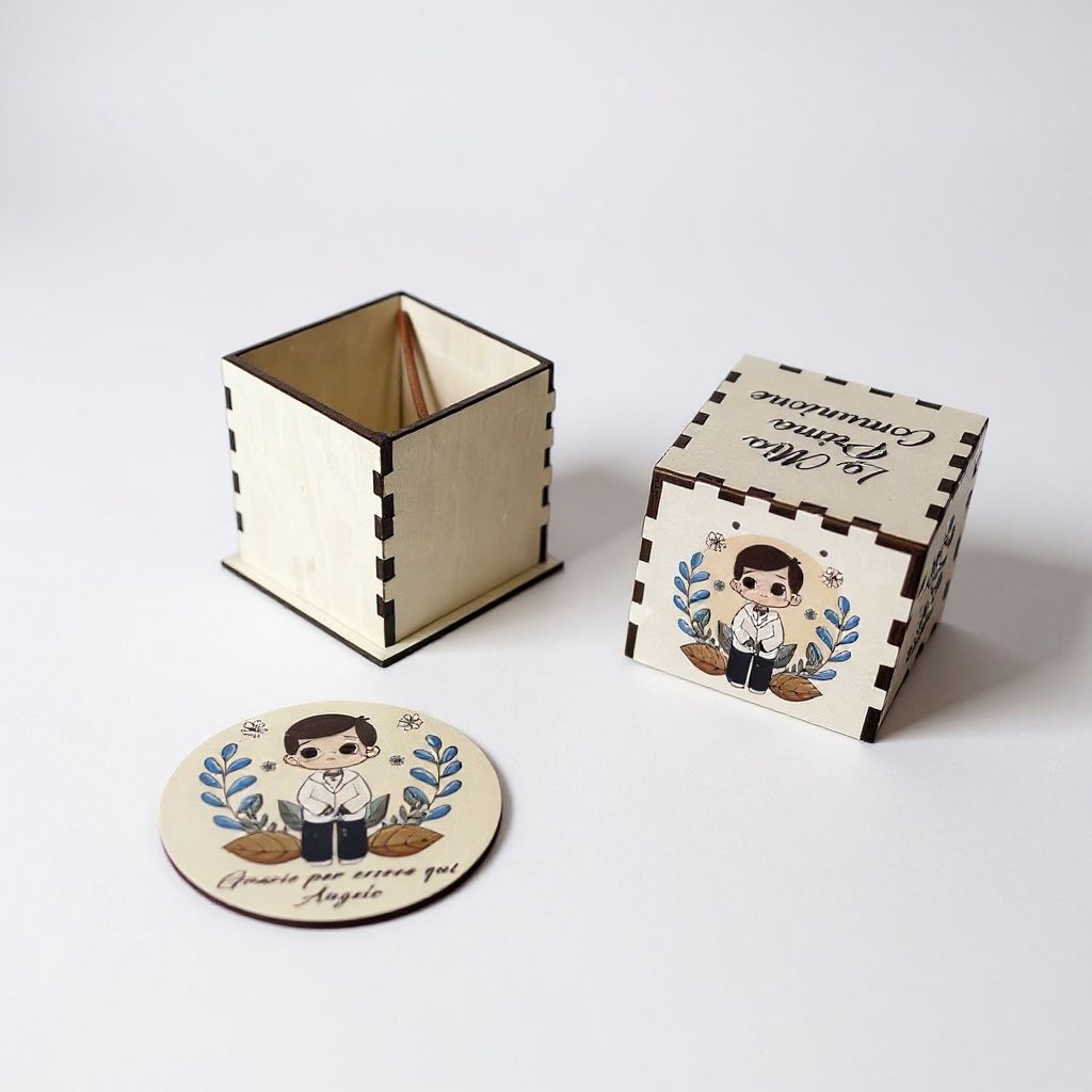 Simpatica scatola in legno con decoro inciso al laser e frase personalizzata e parte sottostante dipinta a mano di color marrone scuro